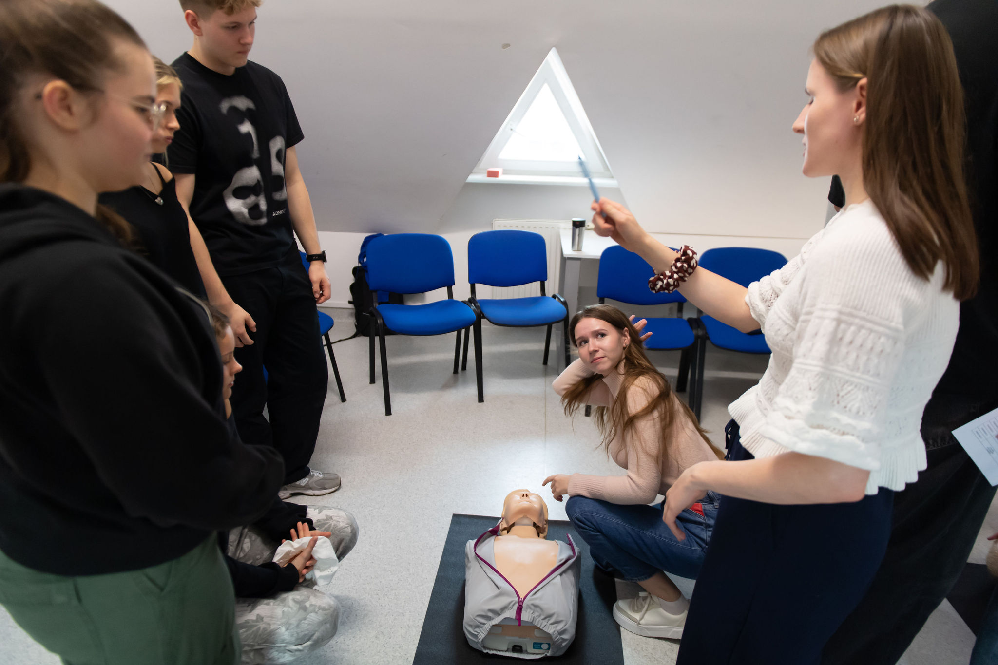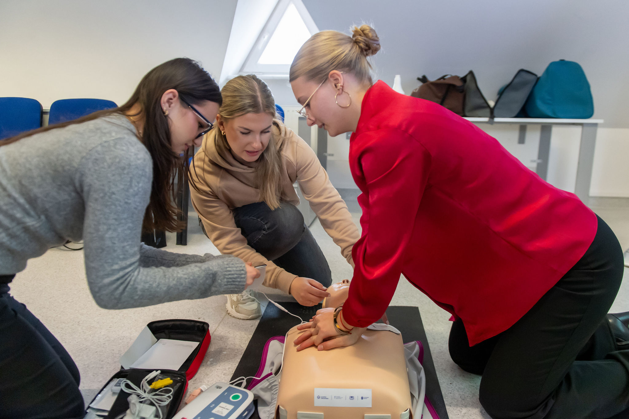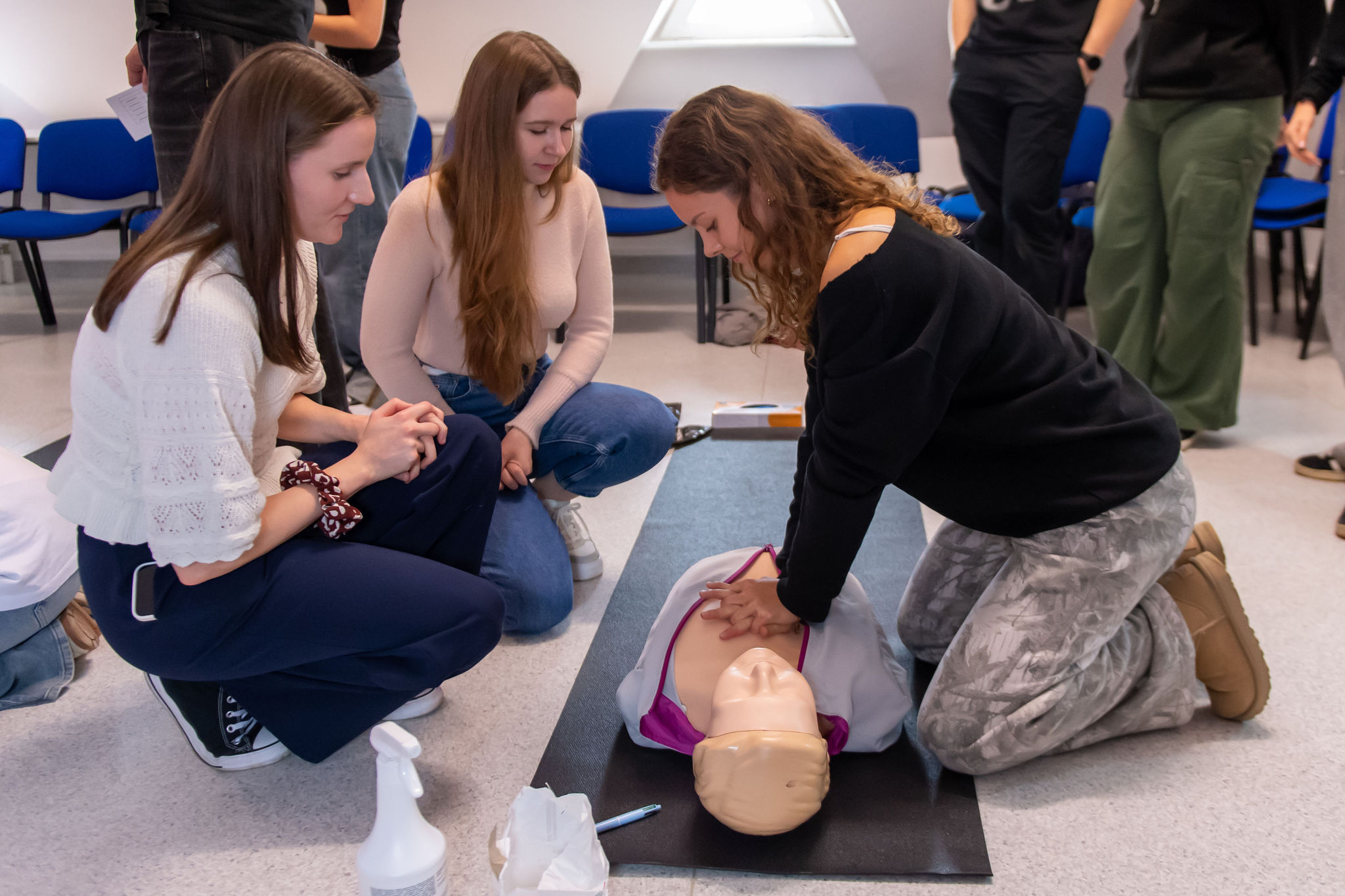 Druga część spotkania przeznaczona była na sprawdzenie teorii w praktyce. Grupa 20 osób została podzielona na 5 czteroosobowych grup, a następnie każda z nich została zaprowadzona do stanowisk, gdzie przekazywano wiedzę na fantomach. Stanowiska obejmowały sposoby resuscytacji na osobie dorosłej oraz dziecku, poprawne użycie defibrylatora AED z wykorzystaniem modelu treningowego, a także przeprowadzono instruktaż wykonania pozycji bocznej bezpiecznej i uchwytu Heimlicha z użyciem kamizelki ACT FAST. Osoby przeprowadzające zajęcia pytały uczestników o sposoby pierwszej pomocy i wykonanie oraz zwracały uwagę na zmieniające się wytyczne, prezentując najnowszą wersję zaleceń pierwszej pomocy.