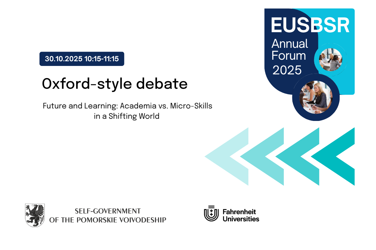 Uczelnie Fahrenheita oraz Samorząd Województwa Pomorskiego zapraszają do udziału w EUSBSR Annual Forum 2025, w ramach którego odbędzie się anglojęzyczna debata oksfordzka pod hasłem: „Future and Learning: Academia vs. Micro-Skills in a Shifting World” z udziałem uczniów gdańskich szkół, studentów i kadry akademickiej Uczelni Fahrenheita oraz przedstawicieli trójmiejskich pracodawców.